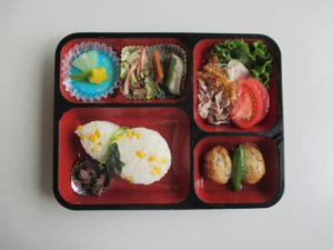 季節感を取り入れ夏らしさを表現したトウモロコシの混ぜご飯、夏バテや食欲減退を考慮し疲労回復と胃腸の働きを活発にする効果を持つビタミンB群豊富な豚肉の冷しゃぶサラダ、涼しげに色付けしハワイアンテイストを試みたミルク寒天など、皆様の食生活をお助けし、何より楽しんで頂けるようなお弁当をこれからも作っていきたいと思います!